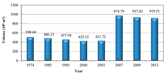 The silting of the dam reservoir represents a real threat to the sustainability of the mobilization of surface water resources in the Bouregreg basin to satisfy required needs. The regulation of the SMBA dam, prior to its raising, was done on a seasonal basis (capacity lower than the annual inflow). In other words, the dam had to discharge the surplus inflows most often from flood spillway or bottom discharge. This technique of management favored the elimination of solid deposits and thus a reduction in the siltation rate of the dam. After the dam was raised and consequently the water capacity of the reservoir increased, the SMBA dam moved to multi-year regulation (capacity greater than annual inflows). By using the restitution devices of the dam, this method of regulation favors storage to the detriment of evacuation, which accentuates the silting rate. Figure 4 illustrates the evolution over time of the normal capacity of the SMBA dam.