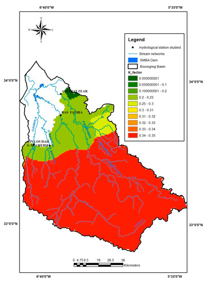 The Kmoy factor used is 0.35. This value corresponds to the silt, with the latter being a sedimentary formation whose grains are of intermediate size between clays and sands. The loss of silt leads to a decrease in the water retention capacity of the soil. The result is an increased erodibility and an increased risk of erosion. Because silt is often suspended in water, it is easily transported by floods and can contribute to the siltation of dam reservoirs. Figure 6 shows the distribution of the K factor over the Bouregreg basin for the four hydrological stations located immediately upstream of the SMBA dam.