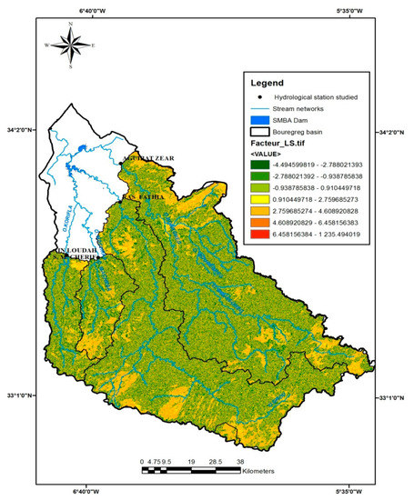 First, the slope map was established by the spatial analyst tool of the ArcGis software using a 90 m resolution DTM. Then, the LS map (Figure 7) by basin was generated using the Wishmeierand Smith formula [9,23]. The mean slopes and mean LS values are given in Table 9.