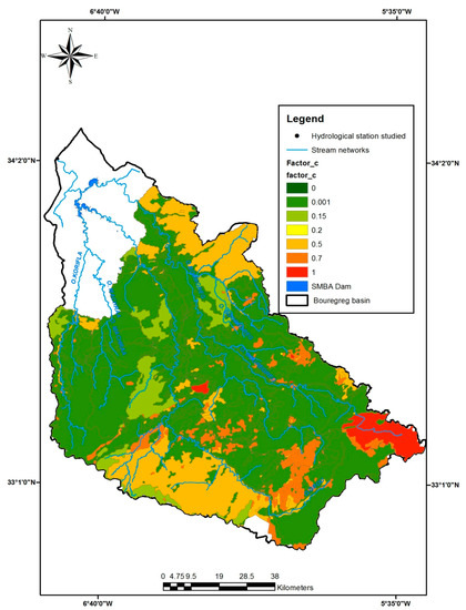 with : partial polygon area, : value of the C factor according to the theme. Figure 8 shows the C factors for each sub-basin of the Bouregreg River.