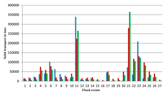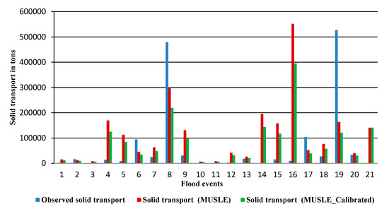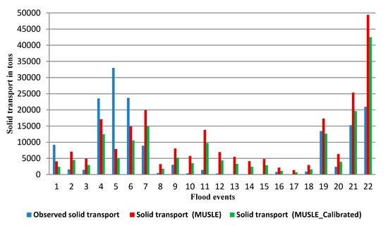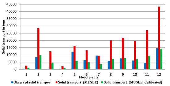 On the other hand, examination of the figures for MUSLE and calibrated MUSLE values shows that the model in these two versions does not predict peaks in solid transport well. It overestimates low values and underestimates high solid transport values most of the time. Indeed, the deviations from observations range from +5% for the dry year, to +102% for the wet year for the non-calibrated model. These results are similar to several applications of the model in different areas around the world [40]. The deviations recorded for the calibrated model are significantly improved. They vary respectively between −30% and +34% [59]. Thus, the calibrated version of the model gives better results with less than +55% error in sediment prediction [60]. These results are interesting on an interannual average, but do not allow the prediction of quantities transported to the stations during unit floods due to the very high dispersion of the relationship between observation and modeling, which results in average-to-low Nash index values. The large positive differences are due to the underestimation of solid transport peaks by the model. Indeed, the model involves the entire basin without concern for the spatial and temporal distribution of rainfall.
