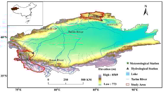In this paper, two important tributaries of the Tarim River, the Yarkant River and Kaidu River, were selected as typical arid region research basins. The Yarkant River Basin (76°40′–79°25′ E to 37°20′–40°10′ N) is located on the northern slope of the Karakoram Mountains (Figure 1) and is the longest tributary of the Tarim River, which is the largest inland river in China []. Within the study area, the average annual precipitation measures about 53.14 mm, whereas the annual potential evaporation is much larger, measuring about 2196 mm. The annual average temperature is about 3.9 °C, which is typical of an inland arid climate. Modern glaciers and permanent snow cover occur in the mountainous areas of the basin. Glaciers in the basin cover 5853 km2, accounting for 11.95% of the basin area, whereas snow cover accounts for about 15% of the basin area. The basin is mainly recharged by ice and snow meltwater, where glacial and snow meltwater accounts for about 75% of the total runoff; interannual variations in runoff are significant [,]. The total annual runoff is about 6.875 billion m3 []. The Yarkant river basin irrigation district is the fourth agricultural irrigation district in China [], which is located in the arid region of central Asia. This region is characterized by a typical temperate continental arid climate, and is the most important region for the production of high-quality grain, cotton and fruits in Xinjiang in particular, and China in general. The Yarkant River Basin is a desert oasis that it is located between the Taklimakan Desert and the Bulgari and Togak Desert. Its terrestrial, riparian, and aquatic ecosystems are fragile, and may be impacted the region’s low and irregular rainfall, high temperatures and evaporation, and notable periods of drought.