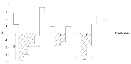 The selection of a hydrological drought index is a process that requires further consideration because the choice of an appropriate drought index is an important parameter inherent in the analysis of drought risk. There are many different hydrological drought index, including Palmer hydrological drought index (PHDI), integrated drought index (IDI), non-stationary standardized streamflow index (NSSI), and so on [,,]. These hydrological drought index have different focuses and different data requirements. For example, the calculation of PHDI needs precipitation, evapotranspiration, and soil moisture, IDI is the integration of meteorological, hydrological, and agricultural droughts, NSSI needs consider both climate change and anthropogenic impacts. Among them, the standardized runoff drought index (SRI) has been widely used given its comparability in time and space as well as simplicity in computation. It also provides a more accurate measure of drought magnitudes relevant to stream water conditions, especially in arid regions [,]. When combined with the SRI, run theory [] allows one to analyze the probabilistic structure of drought durations and severities.