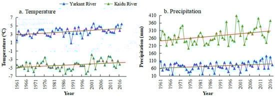 Time series of annual temperature (a) and precipitation (b) in the Yarkant and Kaidu River Basins.