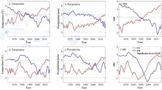 M-K test of annual precipitation, temperature and the SRI in the Yarkant and Kaidu River Basins (a–c: Yarkant River Basin, d–f: Kaidu River Basin).