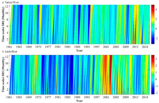Mutiple scales of the standerd runoff index in the Yarkant and Kaidu River Basins (a: Yarkant River Basin, b: Kaidu River Basin).