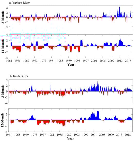 Time series of the SRI-3 and SRI-12 values in the Yarkant and Kaidu River Basins (a: Yarkant River Basin, b: Kaidu River Basin).