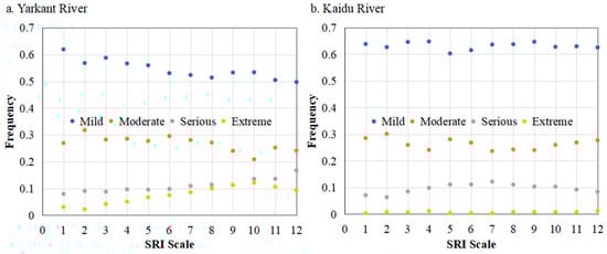 Frequency of drought events of differing levels in the Yarkant and Kaidu River Basins (a: Yarkant River Basin, b: Kaidu River Basin).