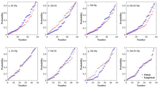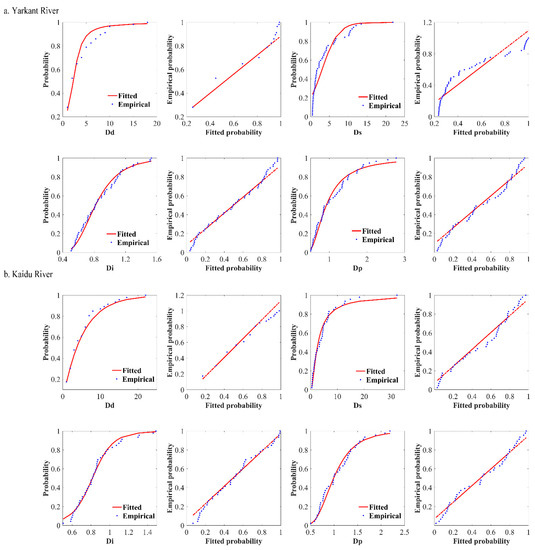 Selection of a suitable marginal distribution function for each variable is required to effectively construct the copula joint distribution function. In this study, the most suitable marginal distribution of the four variables based on a BIC goodness-of-fit analysis (Bayesian Information Criterion) was initially selected. Then 20 functions (e.g., extreme value, generalized Pareto, exponential, and normal) were used to fit the marginal probability distribution of each variable. Finally, the parameters were adjusted by using the maximum likelihood method to obtain the best-fit function of each variable, as shown in Table 4. The Chi-square test was also applied for four variables at a significance level of 5%. The analysis showed that the marginal distribution function of Dd in the Yarkant River Basin was a T Location Scale, the marginal distribution function of Ds was a logistic function, and the marginal distribution functions of Di and Dp were a generalized extreme value function. The marginal distribution function of Dd in the Kaidu River Basin was exponential, whereas the marginal distribution function of Di was a T location scale function. The marginal distribution functions of Ds and Dp were generalized extreme value functions. Figure 9 shows the fitting map and quantile–quantile (Q–Q) plots of the drought variables’ marginal distributions for both rivers. These plots demonstrate that the fitting results were acceptable.