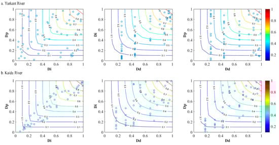 The Gumbel, Frank and Clayton copula functions were chosen to make up the pairwise 2D joint distribution of Dd, Ds, Di and Dp. The parameters were calculated using an inversion of the Kendall’s tau method. The RMSE and AIC values for each group of joint distributions were also calculated. The RMSE and AIC values of the copulas are provided in Table 5. For a particular copula function, the smaller the AIC value of the objective function value, the closer the RMSE value is to 0, and the better the copula function simulates the data. According to this criterion, a suitable copula function for each group of variables for the two basins were selected and are highlighted in bold (Table 5). Table 5 shows that the Frank copula provides a good fit for Di_Dp, Dd_Di and Dd_Dp for the Yarkant River, and Dd_Di for the Kaidu River. The Clayton copula fit the data well for Di_Dp and Dd_Dp of the Kaidu River. The comparison between the empirical frequency and the theoretical frequency of the copula functions is shown in Figure 10. The Frank copula and Clayton copula were the most suitable copula functions for the 2D joint distribution in the study basins.