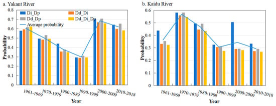 Figure 12 displays the temporal variations in the two-variable, joint distribution probability of Di_Dp, Dd_Di, and Dd_Dp of the two watersheds from 1961 to 2018. The results show that there are obvious differences in the two-dimensional joint probability between two basins. In terms of multi-year average joint probability, the 2D joint probability of hydrological drought variables in the Yarkant River Basin was larger than that in the Kaidu River Basin. The joint probability of Dd_Dp in the Yarkant River Basin was the largest (0.53), followed by Di_Dp and Dd_Di (0.50). The joint probability of Di_Dp in Kaidu River Basin exhibited the largest joint probability (0.45), followed by the Dd_Dp and Dd_Di (0.37). In terms of the trend in joint probability for multiple years, the joint probability of the Yarkant River Basin showed a falling-rising-falling pattern from 1961 to 2018; that is, a downward trend from 1961–1969 and from 1990–1999, and an upward trend from 2000–2009, after which it declined again. Data from the Kaidu River Basin increased from 1961–1969 and from 1970–1979, and generally decreased after 1970–1979. The 2D joint probability of hydrological drought variables in the Yarkant River Basin was larger than that in the Kaidu River Basin. Further, the fluctuations in hydrological drought and joint distribution probability values in the Yarkant River Basin was more obvious, indicating that the overall drought risk in the Yarkant River Basin was larger than that in the Kaidu River Basin.