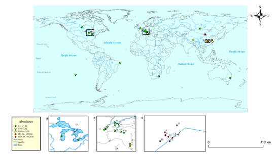 Through the collection and collation of the sample data, we obtained the pollution distribution of microplastics in global freshwater bodies (Figure 1). There were relatively more studies on water microplastics in Asia, Europe, and North America. The order of microplastic pollution in freshwater bodies of six continents was: Asia > North America > Africa > Oceania > South America > Europe. China was the country with the most serious microplastic pollution in the world, with the average concentration of microplastics in the water as high as 3793.38 ± 799.68 n/m3. Among Chinese locations, the average abundance of microplastics in Wuhan Bei Lake was the highest, reaching 8925 n/m3 [18]. Globally, Switzerland had the lowest level of pollution, with an average concentration of 0.04 ± 0.01 n/m3. In terms of the concentration of microplastics, the highest was Lake Neuchatel, which was 0.061 n/m3 [17], and the lowest was Lake Zurich with 0.011 n/m3 [12].