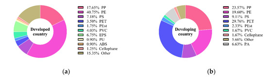 Average percentage composition of microplastics: (a) in developed countries; (b) in developing countries. Polyamide (PA), polyvinyl chloride (PVC), expanded polystyrene (EPS), polyurethane (PU), and acrylonitrile butadiene styrene plastic (ABS).