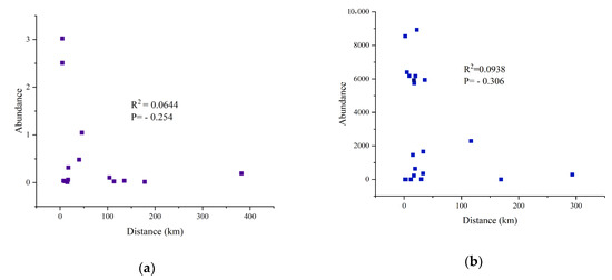A scatter diagram of distance correlation between the concentration of microplastics in the waterbodies and the distance from the city center: (a) in developed countries; (b) in developing countries.