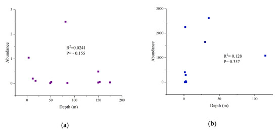 A scatter diagram of the correlation analysis between the microplastic concentration and average water depth in global freshwater bodies: (a) in developed countries; (b) in developing countries.