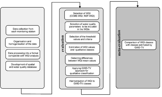 The central concept in developing a meta-evaluation method consists of using the qualitative classification of WQIs to test their performance, instead of using the WQIs value. However, there is not a widely accepted reference value of WQI for testing their performance which is conducted by comparing the WQI classification to the classification derived by GWD-TV approach [17,18]. The applied methodology in this study is illustrated in Figure 1.