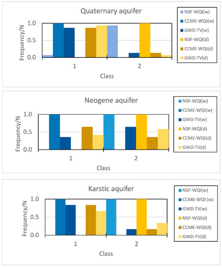 It is observed that CCME-WQI and GWD-TV classifies for both wet and dry periods the Quaternary and Karstic aquifers into lower quality class (Class 1) compared to the NSF-WQI. In contrast, NSF-WQI classifies Quaternary and Neogene aquifers mostly into the highest class (Class 2) for the entire monitoring period (Figure 5). This suggests that the classifications using CCME-WQI and GWD-TV are stricter compared to the ranking which applies NSF-WQI for the Quaternary and Karstic aquifers. A comparative evaluation of WQIs conducted by Alexakis et al., 2016 [15], into the surface water of an artificial reservoir located in the Mediterranean region, also verifies the finding that the classification by applying CCME-WQI is stricter compared to that using NSF-WQI. Only the GWD-TV classifies the Neogene aquifer mostly into the highest class (Class 2), which is clearly explained by the exclusion of DO in the GWD-TV classification (Table 1). The CCME-WQI and NSF-WQI having been established for a broader contamination assessment are, therefore, also susceptible to the variable DO, which strongly contributes to relegating the classification of the Neogene aquifer.