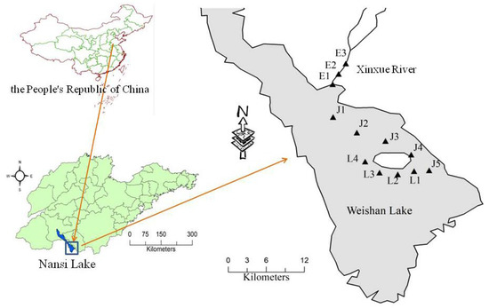 The water transfer and storage function of the Nansi Lake is mainly accomplished by the Lower Lake, i.e., the Weishan Lake, which is located at the southern part of Nansi Lake and accounts for the vast majority of the Lower Lake. Weishan Lake has an average depth of 1.5 m and belongs to a warm temperate and semi-humid monsoon continental climate, with four distinctive seasons, average annual temperature of 13.7 °C, and an average annual precipitation of 700 mm, of which, the summer rainfall accounts for 60%~80% [28,29,30]. In this study, a total of 12 sites belonging to 3 typical waters (River Mouth region, Canal region and Lake region) were investigated (Figure 1). Among them, four sites (L1–L4) are located in the Lake region; mainly affected by aquaculture (crab purse seine farming was nearby these sites, especially L3 and L4). Five sites (J1–J5) are located on the route of Beijing-Hangzhou Grand Canal (Canal region), mainly affected by hydrological fluctuations caused by large vessels and flood discharge. Three sites (E1–E3) are located in the Xinxue River mouth (River Mouth region), and a large amount of organic and inorganic materials from the upstream settled in this region.