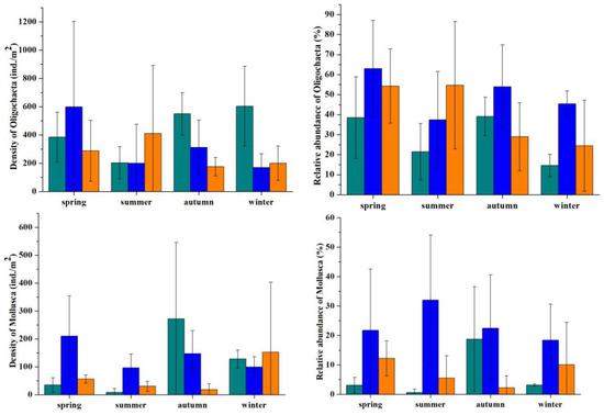 During the investigation period, a total of 72 taxa belonging to 3 phyla (Arthropoda, Mollusca, Annelida), 9 classes and 24 families were recorded in 48 sampling sites among 4 seasons. Among them there were 39 insects, 15 mollusks, 11 oligochaets and 7 miscellaneous animals (Table 2 and Table A2). Species with relative abundance greater than 5% were defined as dominant taxa [43], and Limnodrilus hoffmeisteri, Propsilocerus akamusi, Tanypus concavus, Culicoides sp. were classified as the dominant taxa over the investigation period, with relative abundances were 27.9%, 20.9%, 15.6% and 7.1%, respectively.