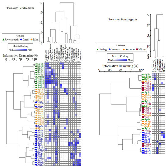 Indicator species analysis (Table A4) evidenced that the River Mouth region was mainly classified by Culicoides sp., Orthocaldius obumbratus, Propsilocerus akamusi, Parachironomus chaetoalus, Gillotia alboviridis, Procladius sp.A, Limnodrilus grandisetosus (total of 7 indicator species) (p < 0.05); Canal region by Corbicula fluminea, Semisulcospira cancellata, Laonome sp., Hemiclepsis sp., Gammarus sp. and Bellamya purificata (total 6) (p < 0.05); and Lake region by Einfeldia dissidens, Tanypus concavus, Cryptotendipes sp. A, Glyptotendipes amplus (total 4) (p < 0.05). While on the temporal scale, only six indicator species were separated out. And among them, only one indicator species (Parachironomus chaetoalus) in the spring; three (Cryptochironomus rostratus, Chironomus riparius, Microchironomus tener) in the summer; two (Propsilocerus akamusi, Dicrotendipes tritomus) in the winter, and none in autumn. Based on the indicator species, two-way cluster analysis was used to represent the above results (Figure 4), and the results illustrated how the taxa interacted through spatiotemporal scales and reveal patterns in the changing composition of the macroinvertebrates; moreover, we also found that more taxa as indicator species were screened out among the regions.