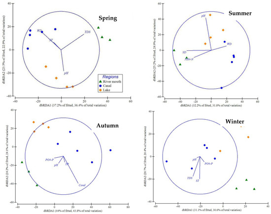 Results of distance-based redundancy analysis (db-RDA), giving the relative influence of significant environmental variables on community composition in the four seasons.