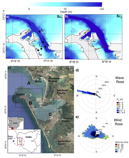The simulation period runs from October 2012 to November 2013. This period of approximately one year is characterized by an average significant wave height of 1.5 m, reaching maximum values in winter (H≈ 5 m) coming from the NW (Figure 2a,b). Winds come usually from the NW-SW and NE-SE with average speeds of 6 m/s (Figure 2c). Storms are more frequent in winter with wind speeds up to 15 m/s. The river discharges are reduced (10 m/s and 30 m/s for the San Pedro and Guadalete rivers, respectively), considering the tidal prism of the bay (4 × 10 m, [36]). This year can be considered representative year due to these forcing; it is also selected due to its proximity to the date of the bathymetric data.