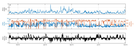 Wind and wave conditions during the simulations (Buoy 2342): (a) significant wave height, (b) wave peak period and direction and (c) wind speed.