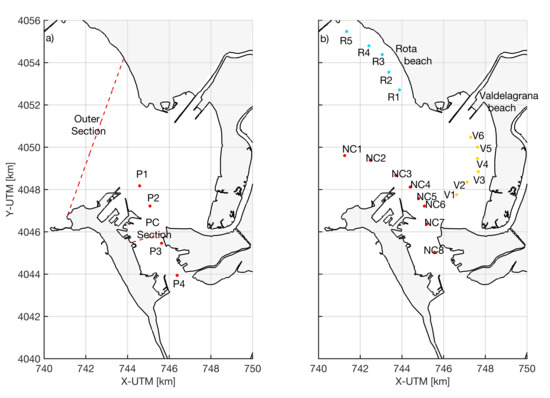 (a) Locations (points) and sections (dashed lines) for the water dynamics and water renewal analysis. (b) Locations for the wave analysis at the navigation channel (red), Valdelagrana beach (yellow) and Rota beach (cyan).