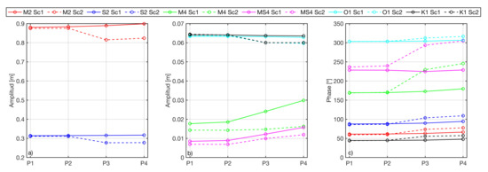 The values of amplitude (panel a,b) and phase (panel (c) of the constituents M2 (a), S2 (a), M4 (b), MS4 (b), O1 (b) and K1 (b), are represented for points 1–4 (from left to right). Solid line (dashed line) represents Sc (Sc).