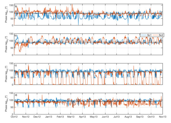 Phase differences between free surface and projected velocity on the axis of the channel for the four points of study (P1–4, panels a–d respectively) Blue line (orange) represents Sc (Sc). The standing wave is represented by the black line (90).