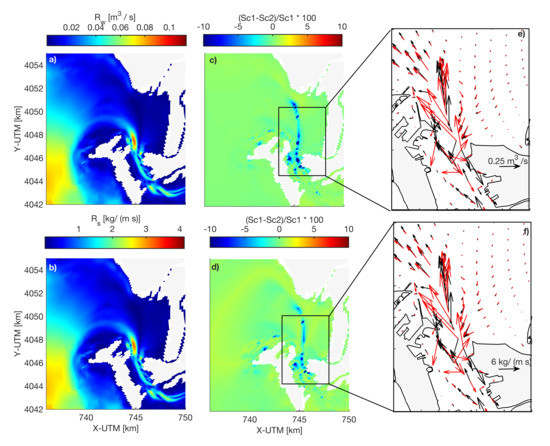 The differences in the and distributions between scenarios are shown in Figure 6c,d, respectively. The largest differences in both (15%) occur around the navigation channel, where either the water depth and the geometry of the section have changed. In addition, the baroclinic effect is larger (7%) in the outer bay because of its greater differences in salinity (10%). The directional changes show two trends: (1) in the outer bay, where the vectors rotate slightly counterclockwise and (2) in PC, where vectors rotate towards the channel margins, which will cause an increase of the sedimentation in the shallower areas of PC. There is no difference between the directions of R and R after the interventions. Therefore, it can be concluded that the interventions intensify the importance of the baroclinic effects, due to the increase in the difference in salinity between the outer bay and PC as a consequence of the increase of the water volume in which salt have to be dissolved.