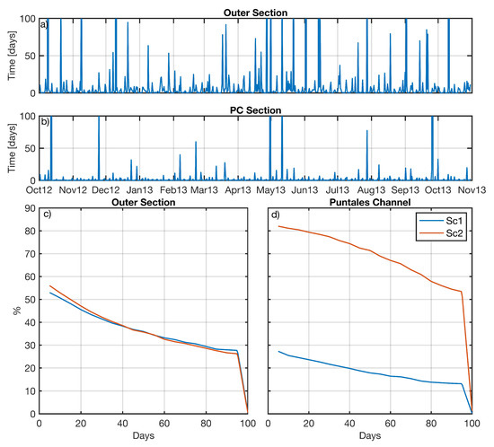 Figure 7 shows the percentage of time in the simulated year during which the flushing time in a tidal cycle exceeds a certain number of days for the two defined sections. It is observed that for Sc the flushing time is 15–20 days for the outer bay (Figure 7a), exceeding 50 days during some tidal cycles, especially during summer and winter storm periods. In the case of PC, the average is 5 days with fortnightly variations due to spring/neap cycles (Figure 7b), rarely exceeding 50 days in summer. The changes triggered by the interventions (Sc, orange line Figure 7c,d) are much more evident for PC, increasing the probability of exceeding 10 days by 40%, which implies that there is a greater renewal of water from PC. In the outer bay the values are very similar with a slight variation with respect to Sc (5%), increasing the probability of occurrence for 0–40 days, and decreasing for 60–80 days.