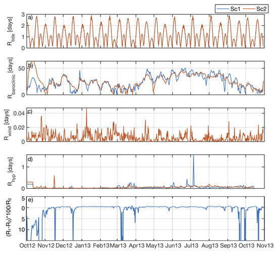 Time variation in exchange rate due to different processes: (a) Barotropic, (b) Baroclinic, (c) Wind, (d) Hypersalinity. Blue and orange lines indicate the results for Sc and Sc, respectively; and (e) differences of the modelled R (%) between scenarios.