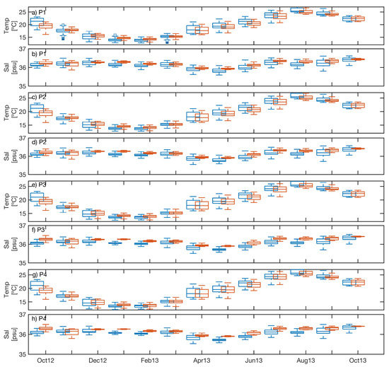 Figure 9 represents the annual distribution of temperature and salinity for the 4 locations defined. For Sc the salinity decreases from P1 to P3 (from 36.3 to 36 psu, Figure 9f) and then increases towards P4 (36.2 psu, Figure 9h). The lowest values are those found in March-April due to increased precipitation, while the highest values are reached in July-August due to high evaporation. The temperature follows the same trend as the air temperature, which in turn shows clearly a seasonal variability. It is observed that values are very similar at all points, being slightly lower at P3 and P4 (Figure 9e,g, respectively; 1–2). See Zarzuelo et al. [28] for further details.