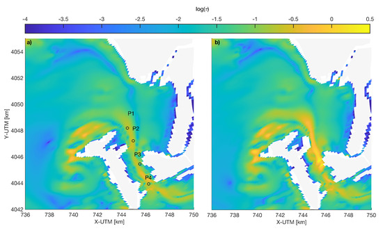Spatial distribution of the mean bed shear stress magnitude (logaritmic) for Sc (a) and Sc (b) for spring tides.