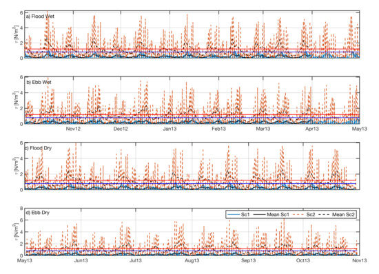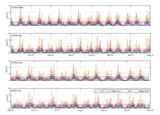 Temporal distribution of the bed shear for point 1 (Sc—blue line; Sc—orange line) for flood and ebb combined with wet (panels (a,b) and dry periods (panels (c,d). Black solid (dashed) line correspond to the mean bed shear stress. Red (blue) line represent the for erosion (sedimentation).