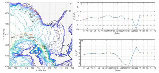 Figure 13b,c shows the module and direction variations between the two scenarios. After interventions, a decrease of its module is observed along Valdelagrana beach, especially in the less wave-exposed area of the coastline, where it reaches about 20%. rotates only 1–2 anti-clockwise. Considering these small changes and the fact that the module of decreases more or less uniformly along this beach, interventions are not expected to have consequences on its planform, as it does not favor longitudinal energy gradients. Something very similar occurs in the navigation channel, especially towards the inner bay where the values were higher, due to the drastic change in depth and section. Moreover, in this area the change in direction is more pronounced, reaching 7 in NC7. Therefore, the reduction of caused by a decrease in wave height around the new container terminal will improve its operability with respect to the current situation. Knowing that climate change is latent, and that rising sea levels and more severe storms can cause an increase in wave heights, a possible mitigation alternative would be dredging which could reduce the energy content of the waves in the bay. In Rota, is not influenced by interventions, while the direction of R1 only varies by 1. Therefore, the influence of interventions on coastal morphodynamics is very limited. was calculated for the deep water data of buoy 2342 for all available years to determine the root mean square error (RMSE, black dashed line, Figure 13b,c) to determine at which points the effects of the interventions are greatest (exceeding RMSE). The values of the module are lower than RMSE except in NC9, while the directions do not exceed RMSE except in NC6 and NC7, where as described above, the greatest effects due to the interventions are observed.