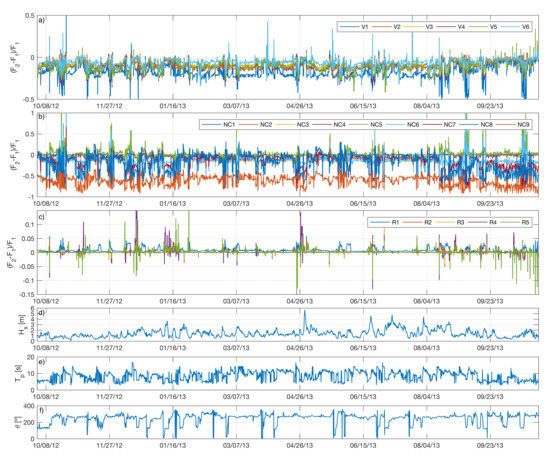 Figure 14 shows the temporal variations of between scenarios for the points analysed above during the whole simulated year. In Valdelagrana, is reduced throughout the year (30%), with oscillating values in V6. In NC (Figure 14) the variations are more remarkable for NC1-3 and NC9, where there is a decrease in with respect to Sc of up to 80%, originated by average wave heights (2 m) coming from SE-E (Figure 14). In Rota (Figure 14c) these oscillations are only about 10%, caused by the same wave conditions as in NC. Therefore, it can be concluded that interventions cause a reduction in the energy content of the beaches of Valdelagrana and Rota, altering the energy that the sediment mobilizes and causing an alteration in its morphodynamics (more relevant in Valdelagrana) for specific events, although the average energy flow for the whole year does not show great differences.