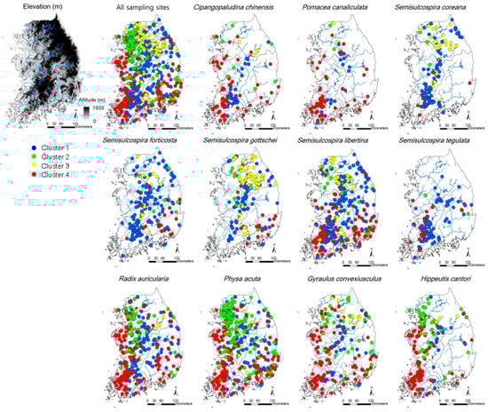 Freshwater gastropods comprise 5% of the global gastropod fauna but are facing a disproportionately high degree of threat according to the 2019 IUCN Red List of Threatened Species (http://www.redlist.org, Cambridge, UK) [1]. Furthermore, 74% of gastropod species have been classified as vulnerable, endangered, threatened, or already extinct in the United States and Canada [2]. Similarly, in mollusks, 40% of freshwater bivalve species in the world are near threatened, threatened, or extinct [3]. In South Korea, two rare species (Clithon retropictus and Koreanomelania nodifila) are listed in the Red Book as endangered, and five species (K. nodifila, Koreoleptoxis globus ovalis, Semisulcospira coreana, Semisulcospira forticosta, and Semisulcospira tegulata) are endemic in the database of the National Aquatic Ecological Monitoring Program (National Institute of Environmental Research, Incheon, South Korea) [4]. These threats are of particular global concern because most freshwater gastropods are endemic with small geographic ranges [2,5,6,7].