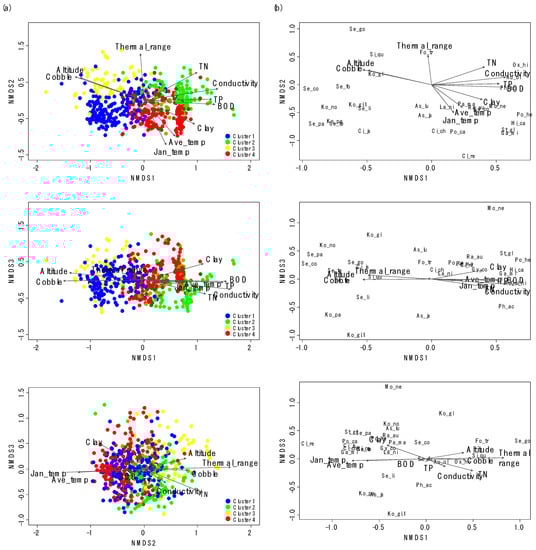 NMDS also showed differences in gastropod assemblage composition (Figure 3), reflecting the classification of sampling sites in CA. After the NMDS ordination with gastropod assemblage, environmental variables were visualized with sampling sites and gastropod taxa with biplot. We selected the first three NMDS axes based on the Kruskal’s stress value (the first three axes stress = 13.8). Clusters 1 and 3 and Clusters 2 and 4 were differentiated on the NMDS 1, whereas Clusters 2 and 3 and Clusters 1 and 4 were divided on the NMDS 2 (Figure 3a). However, the differentiation of clusters was not clear on NMDS 3. NMDS 1 reflected the gradient of water quality, whereas NMDS2 presented the gradient of temperature. On the ordination with NMDS 1 and NMDS 2, sampling sites with high values of cobble (%) and altitude were located on the left side of NMDS 1, whereas sites with high values of TN, conductivity, BOD, and TP were located on the right side of NMDS 1 (Figure 3a). Sampling sites with high values of average temperature in January were located on the lower part of NMDS 2, whereas sampling sites with high values of TP and conductivity were located on the lower part of NMDS 3. Species which prefer riffle areas with a large-sized substrate and good water quality, such as Koreoleptoxis globus ovalis, K. nodifila, S. coreana, and S. forticosta, were on the left section of NMDS 1 (Figure 3b). Conversely, the high values of TN, conductivity, BOD, and TP strongly influenced the distributions of R. auricularia, P. acuta, Gyraulus convexiusculus, and H. cantori. The average temperature in January was influential to the distributions of P. canaliculata and C. retropictus.