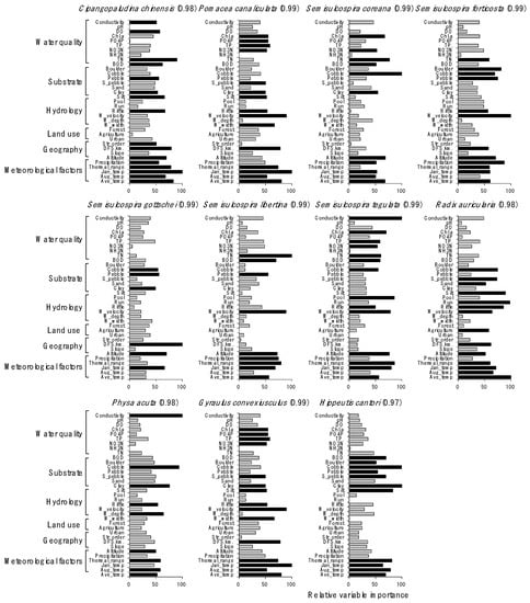 Relative importance of environmental variables for predicting the distribution of gastropod species in the random forest model. Numbers in parentheses indicate the predictability of the model for each species. black bar: ≥50 of the relative importance value and gray bar: <50 of the relative importance value.