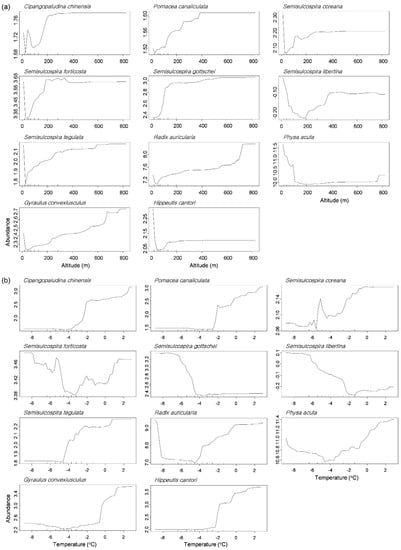 The partial dependence plot displayed that each gastropod species responded differently to the environmental factors in the RF models (Figure 5 and Figure S1). We visualized two variables showing a strong gradient in the NMDS plot: altitude on NMDS 1 and the average temperature in January on NMDS 2 (Figure 3). Most of genus Semisulcospira, C. chinensis, and P. canaliculata displayed increase of their abundance as increase of altitude, whereas P. acuta was abundant mostly at low altitude (≤160 m, Figure 5a). The high abundance of P. acuta was also related to high concentrations of TN (≥1.8 mg/L, Figure S1). Meanwhile, responding to temperature, the abundance of P. canaliculata increased with an increasing average temperature in January above −2.0 °C, whereas abundances of S. gottschei and S. libertina were high at a lower temperature in January (−4.2 °C and −2.2 °C, respectively, Figure 5b).