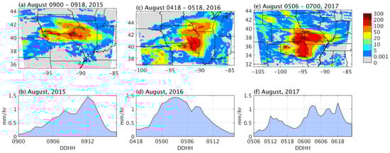 This study examines three synoptic-scale convective events over the central United States. The first event lasted 18 h and occurred on August 9, 2015; the second event lasted 24 h from 1800 UTC August 4 to 1800 UTC August 5, 2016; and the third event lasted 36 h from 0600 UTC August 5 to 0000 UTC August 7, 2017. Figure 1 shows the spatial distribution of total precipitation and the time series of domain-mean hourly precipitation for each event. The first event was a diurnal precipitation event, the second was a nocturnal precipitation event, and the third was a mixed diurnal and nocturnal event. The mechanism for diurnal precipitation is deep convection due to surface heat and moisture flux, while that for nocturnal precipitation is likely large-scale upward motion and moisture advection []. The three events had different spatial coverage but similar precipitation intensity. The precipitation data are linearly interpolated onto the grids used by the WRF model (see Section 2.3) using the griddata function provided by Matlab. We assimilate only the upper-left three grids of every 2-by-2 grid in the WRFDA system, that is, 75% of the observations are used in the WRFDA system, and the remaining 25% are used as independent observations when computing statistical metrics.