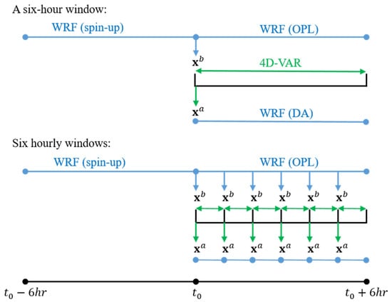 where the state consists of temperature, pressure, zonal and meridional winds, and humidity; is the background state at initial time, and is its error covariance matrix; is the model operator that predicts state variables at time , and is the observation operator that transforms the state variables into the form of observations; is the observation at time , and is its error covariance. In this study, because we assimilate precipitation only at the end of assimilation windows, there is only one time-interval for observations (i.e., ).