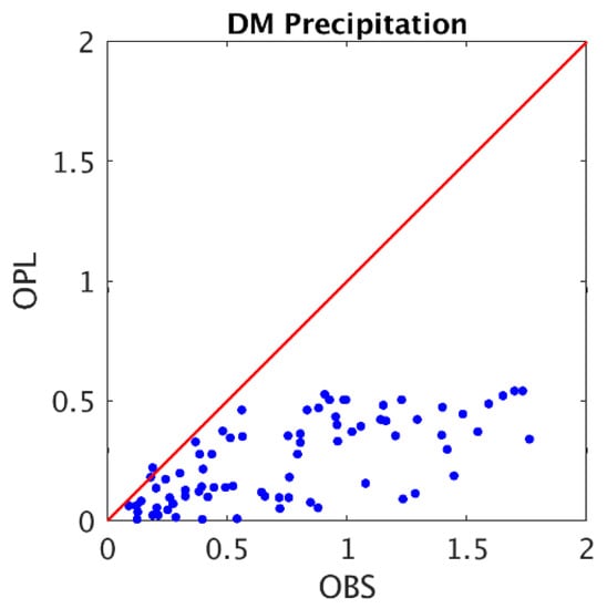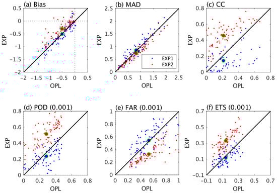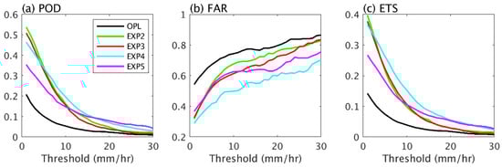 Figure 3 is a scatter plot of hourly domain-mean precipitation from OPL estimates and those from the IMERG observations for the three precipitation events. It shows that the WRF model underestimates the domain-mean precipitation for nearly all the 78 h we studied, which agrees with previous studies that show the limitations of numerical prediction models in estimating summer convective precipitation [,]. To find an appropriate way to assimilate the IMERG observations into the WRF 4D-Var system, we conducted five assimilation experiments, i.e., six-hour (EXP1) and hourly (EXP2) assimilation windows (Figure 2), nontransformed (EXP2) and logarithmically transformed observations (EXP3), and a different observation error for the nontransformed and logarithmically transformed observations (EXP4 and EXP5). The setups of the five experiments are listed in Table 1. To evaluate precipitation estimates from the experiments, we applied several statistical metrics, including the bias, the mean absolute difference (MAD), the correlation coefficient (CC), the probability of detection (POD), the false alarm ratio (FAR), and the Equitable Threat Score (ETS). The equation and the perfect value of each metric are listed in Table 2.