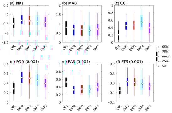 Boxplots of statistical metrics of hourly precipitation estimates estimated from each assimilation experiment and the OPL experiment. The threshold for calculating the POD, FAR, and ETS is 0.001 mm/h, which is the threshold of distinguishing precipitation or no precipitation in the IMERG data. EXP2 and EXP3 represent experiments with nontransformed and logarithmically transformed precipitation with constant observation error, respectively; EXP4 and EXP5 are as for EXP2 and EXP3, but with increasing observation error with precipitation magnitude.