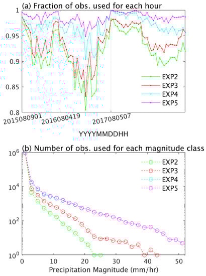 (a) Fraction of observations used in each assimilation experiment to the total available observations at each hour. (b) Number of observations used for all the hours at different magnitude classes with 1 mm/h intervals. EXP2 and EXP3 represent experiments with nontransformed and logarithmically transformed precipitation with constant observation error, respectively; EXP4 and EXP5 are as for EXP2 and EXP3, but with increasing observation error with precipitation magnitude.