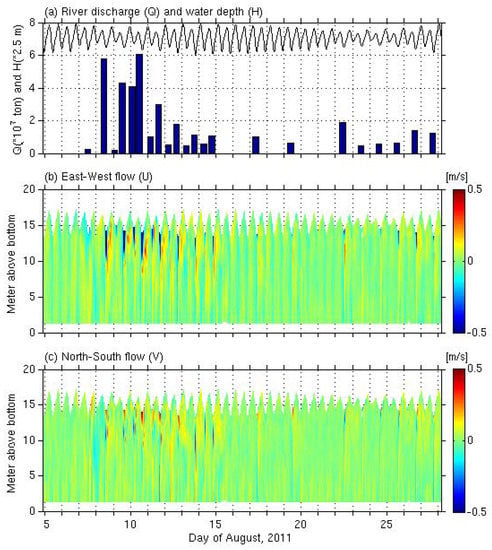 Figure 2 shows the discrete freshwater discharge and mean current velocity for U and V, during 5–28 August 2011. According to typical gate operation procedure, the gates were opened only during the low tide to prevent saltwater intrusion. On 11 August, over 6 × 107 tons of freshwater were discharged. After the discharge, the westward surface current rapidly increased to greater than 0.5 m/s and affected at least 5 m below the surface. At the same time, an opposite flow to the east formed in the lower layer. The sudden release of freshwater also increased the north–south component of the flow in a short period of time. When there was no freshwater discharge, the current speed was less than 0.25 m/s and the flow structure simply repeated the flood and ebb states such that eastward flow occurred during flood, westward flow occurred during ebb, and almost zero flow occurred during both high and low slack tides.
