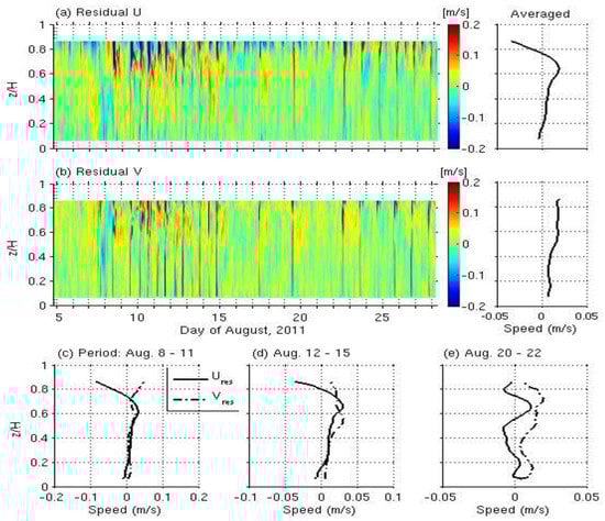 Change of vertical structure of the residual (tide-removed) flow: (a) east–west component, (b) north–south component, and mean flow structure of each period such as (c) high (i.e., Q > 4 × 107 ton on 8–11 August), (d) low (i.e., Q < 1 × 107 ton on 12–15 August), and (e) no freshwater discharge (20–22 August). Two profiles on the right side of (a,b) are the residual over the entire period. The negative values on (a,b) indicate west- and south-directed residual velocities, respectively.