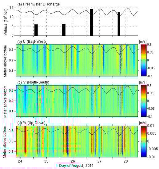 Figure 4 shows the time variation of sea level, the amount of freshwater discharge, and the horizontal and vertical flows at the bottom. The magnitude of flow was about 0.1 m/s in the horizontal component and about 0.01 m/s in the vertical component, and the ebb and flood patterns were not clear since there were several irregular changes in the flow direction even during the flood or ebb tides. The vertical structure of flow indicated that the current magnitude of each profile was similar at 0.15–0.35 mab (Figure 4). However, it began to decrease from 0.15 mab and became almost zero near the bed due to the bottom friction. This phenomenon became clearer as the speed increased. The bottom seaward flow during the low tide was evidence of the fact that the freshwater release can directly affect the bottom flow strength and reverse the flow direction. When freshwater was discharged in the surface layer, the bottom seaward flow was intensified for a short time and then a landward flow appeared (Figure 4b). During 24–28 August 2011, the dam gates opened four times during the low tide: two openings on 24–25 August discharged about 6 × 106 tons of water and the other two openings released over 12 × 106 tons of water (Figure 4a). As the amount of freshwater discharge increased (i.e., on 26 August and 27 August), the change in the flow direction and strength was sharper than the other two cases. One possible reason that the reversed (landward) flow occurred in such a short time could be a result of water mass conservation. When freshwater moved rapidly seaward due to the dam gate opening, it could have produced a return flow in the bottom layer to make the water mass balance inside the estuarine area. The response of the north–south and up–down flow showed a spike-like change just after the freshwater discharge (Figure 4c,d). It is noted, on the other hand, that the flow speed was very weak or almost zero during the no freshwater discharge periods on 25 August and 27 August. It is also interesting to mention the fluctuation of the vertical flow since it displayed directional change (positive to negative) as the freshwater rapidly moved seaward in the upper layer even though the speed was one order of magnitude less than that of the horizontal flow (Figure 4d). The speed of the vertical flow was about 1 cm/s. This fluctuation of the vertical flow occurred during the low tide and was intensified when the freshwater was discharged. Therefore, the freshwater release by opening of the dam gate caused a rapid and strong seaward surface flow, and its impact could reach the bottom and influence the bottom flow structure such as with sudden direction changes in both the horizontal and vertical flow.
